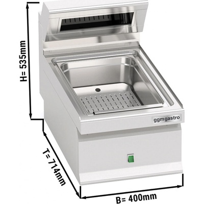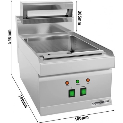 Lázeň elektrická na hranolky, jednofázová vyrobená z nerezové oceli. Horní infrazářič s topným tělesem. Vana v cm: 30,5x51x16,5 v. Falešné děrované dno. Vhodná do kuchyně do 300...