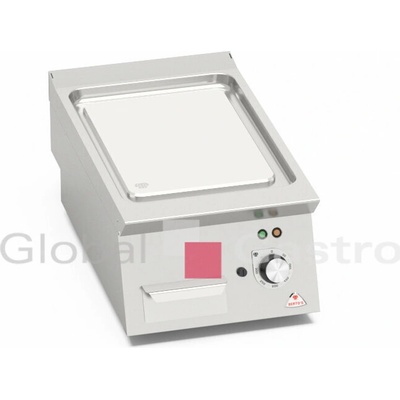Zesílená grilovací deska s hladkým (rýhovaným) povrchem z oceli a zvýšenými postranními lemy. Topné těleso je umístěno pod grilovací plotnou. Dvě nezávislé zóny, regulační...