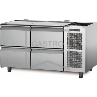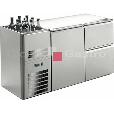 Dvousekcový barový chladící stůl. Model v celonerezovém provedení (AISI 304), s chlazenou vanou (312x515xh250) nad agregátem (vpravo/vlevo). Digitální ovládání, ventilované...
