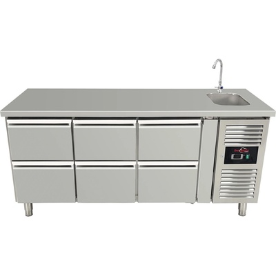 Velkokapacitní pracovní a chladicí stůl s dřezem – ideální do profesionální kuchyně Model DAS4100TNSTRE je kombinací výkonného chladicího zařízení a praktického dřezu. Vhodný...