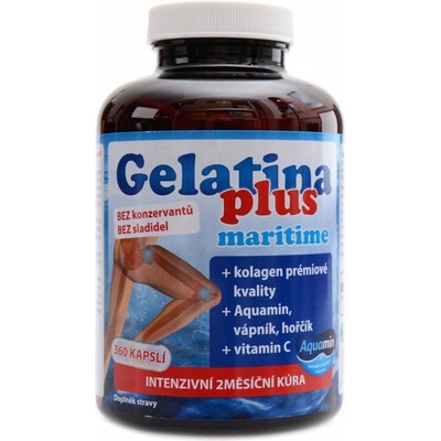 GELATINA PLUS maritime 360 kapslí Gelatina Plus Maritime je doplněk stravy ve formě kapslí, který obsahuje komplex kolagenu, minerálních látek a vitamin C. Neobsahuje konzervanty a sladidla. Vápník a hořčík jsou potřebné pro udržení normálního stavu kostí a svalů....