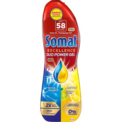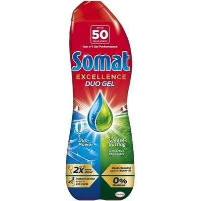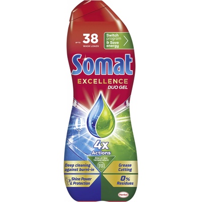 Henkel Somat Excellence Duo gel do myčky na mytí nádobí, 2× 540 ml, 60 dávek Mycí prostředek na nádobí rozpouští připálené zbytky jídla, odstraňuje usazenou mastnotu, nezanechává zaschlé kapky vody a dodává zářivý lesk, a to i na eco programy.