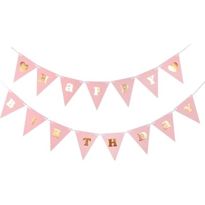Banner – světle růžový se zlatým nápisem Happy Birthday Vyrob si sám stylový narozeninový banner! Balení obsahuje jednotlivá písmena tvořící nápis „Happy Birthday“ a cca 2,5 m...