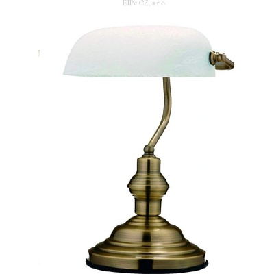 Stolní bankovní lampa Globo Antique. - Podstavec ve staromosazné barvě. - Stínidlo z bílého skla. - Vypínač na kabelu. - Žárovka E27 není součástí.