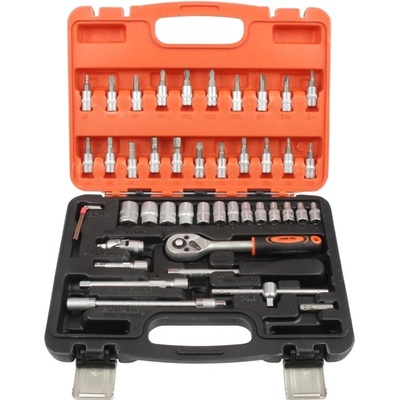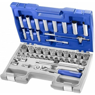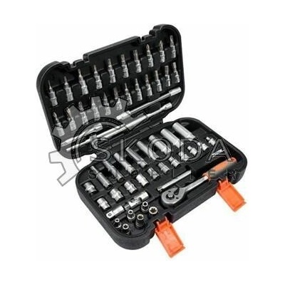 Gola sada s nářadím v metrických rozměrech, vodicí 4hran 1/2“, 42 dílů v plastovém kufříku s kovovými přezkami a panty – Tona Expert E032908Kompaktnější, ale velmi praktická a...