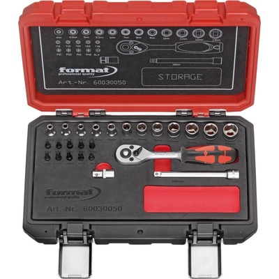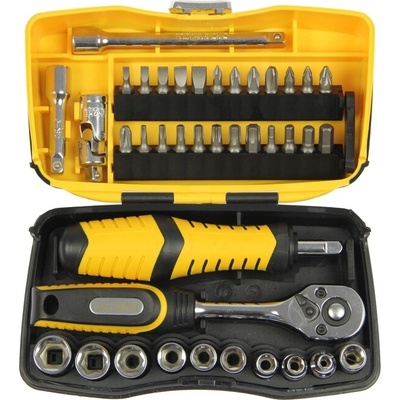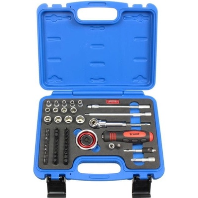 Obsahuje: 1/4” ráčna 130mm 1/4” nástavec 50, 100, 150mm 1/4” nástavec s rukojetí 150mm 1/4” univerzální kardan 34mm 1/4” vratidlo 115mm 1/4” adaptér na bity...
