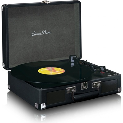 Nostalgický přehrávač vinylů s jednoduchým ovládáním, přenosným provedením a pohodlným připojením pro každodenní poslech.