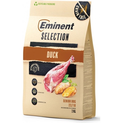 Eminent SELECTION GRAIN FREE Senior Duck 22/10 12 kg na kachně Kompletní krmivo BEZ OBILOVIN pro starší psy Vitalita a pohodlí ve zlatém věku Starší psi mají úplně jiné nutriční potřeby a jejich blahobyt je pro nás prioritou. Naše krmivo Eminent Selection DUCK Senior...
