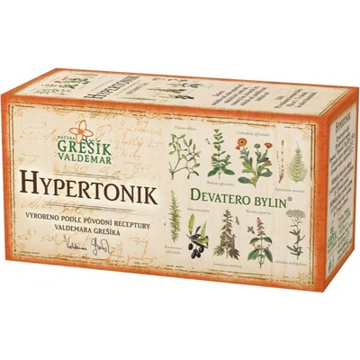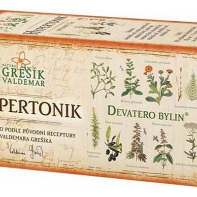 Hypertonik Devatero bylin porcovaný 20x1,5g - Valdemar Grešík Působí příznivě na oběhovou soustavu a normální krevní tlak. Složení: meduňka nať, máta peprná nať, měsíček květ, jmelí nať, rozmarýn list, olivovník list, srdečník nať, přeslička nať, řebříček naťPije se 1...