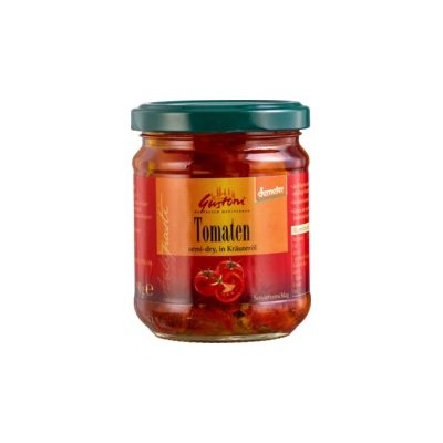 Sušená rajčata v bylinkové oleji Ručně nakládaná sušená rajčata v oleji s česnekem a bylinkami. Skvěle se hodí do omáček, salátů a předkrmů. Složení: Rajčata* (55 %),...