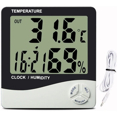 Teploměr vnitřní / venkovní s vlhkoměrem a pamětí Digitální teploměr pro měření vnitřní a venkovní teploty + vlhkoměr, paměť na maximální a minimální hodnoty.Hodiny+budík....