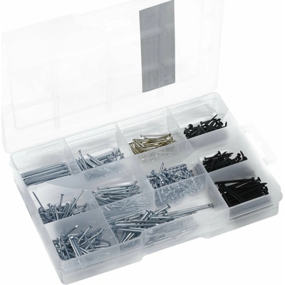 hřebíky Obsah: konvexní hřebík: 50 ks 1,6 x 15mm / šroubový hřebík: 50 ks 2,5 x 20mm / ocelový hřebík černý: 37 ks 2,2 x 38mm / 45 ks 1,8 x 25mm / hřebík kolářský: 50 ks 1,6 x...