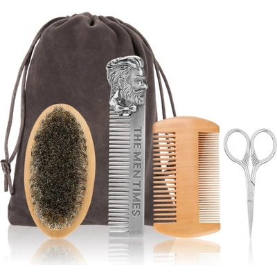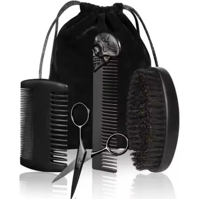 Sada kartáče, dvou hřebenů a nůžek na plnovous. Ideální kombinace pomůcek pro vousáče v dárkovém pytlíku.