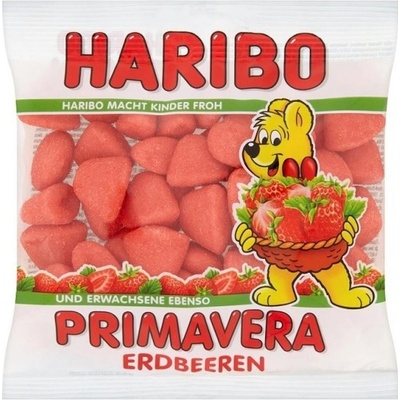 HARIBO Primavera jahůdky 100 g Jemný pěnový cukr obalený v lehce křupavé jahodové krustě = to nejlepší pro všechny milovníky jahod! Složení: - Cukr,Glukózový sirup, - Želírující látka: želatina,Ovocná šťáva z koncentrátu 2% (jahoda, černý bez), - Kyselina:...