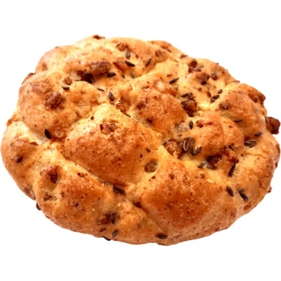 Pšeničná mouka, voda pitná, žitná mouka, stabilizovaný kvas, jedlá sůl s jódem, pekařské droždí, zlepšující přípravek, kmín. Posyp kmín. Na povrchu: jedlá etiketa....