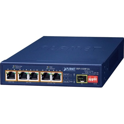 PLANET BSP-115HP-5A Solární napájecí PoE switch s integrovaným MPPT regulátorem nabízí 5× RJ-45 10/100/1000 Base-T s PoE IEEE 802.3af/at/bt, 65 W PoE budget, DIP switch a 1× SFP...