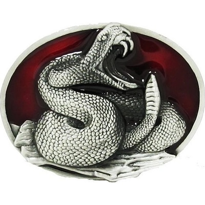 Oválná kovová přezka na kožený opasek v šířce do 3,9 cm s motivem hada a motorky.