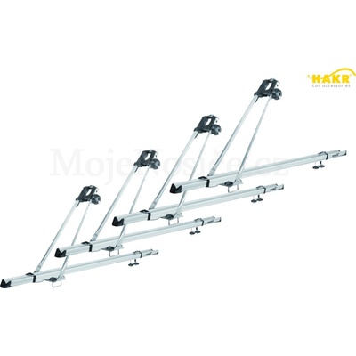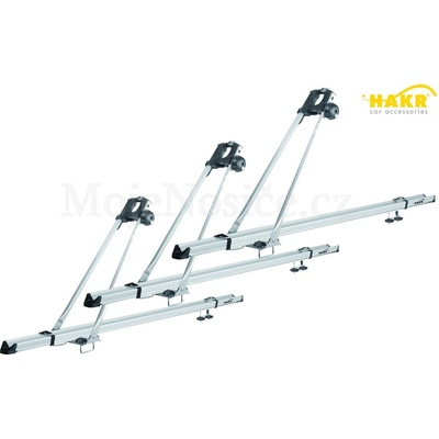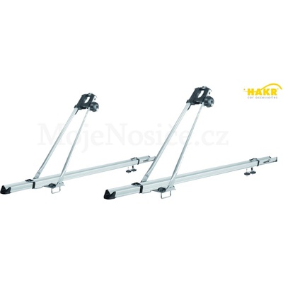 Střešní nosič jízdních kol Hakr Cyklo Pro Alu. Připevnění k základnímu střešnímu nosiči pomocí ocelových třmenů ve tvaru "U" o rozteči 55 mm a plastovými ručními maticemi. Použitelný pro většinu jízdních kol s průměrem rámové trubky 35-75 mm nebo oválné trubky 50x70...