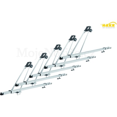 Hliníkový nosič kol HAKR Cyklo PRO ALU (sada 5 kusů) Nosič kol střední třídy, maximální přepravní rychlost 130 km/h Montáž za pomocí ocelových u-profilů (třmenů) s roztečí 58mm . Montáž do t-drážek ( šířka drážky 22mm ) alu profilů střešních nosičů není možná.
