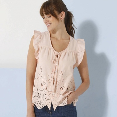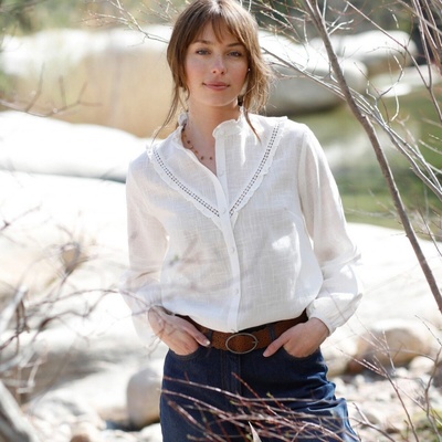 Dokážete odolat halence z madeiry? My ne! Výstřih do V s průstřihem a šňůrka + střapce. Vpředu celopropínací na perleťové knoflíčky. Volánové krátké rukávy. Vzadu v ramenou...
