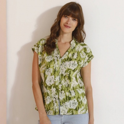 Pro romantický look zvolte halenku s květinovým potiskem a výstřihem do V s drobnými volány. Perleťové knoflíčky + pružná očka, kryté patkou. Vpředu vsadka a nařasení. Krátké...