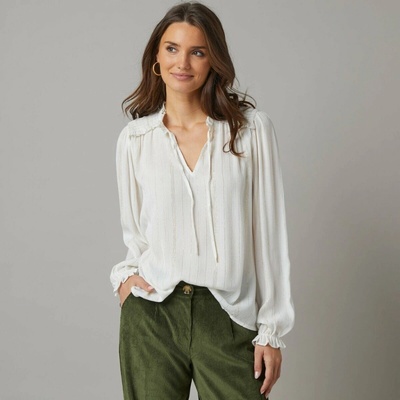 Dokážete odolat halence z madeiry? My ne! Výstřih do V s průstřihem a šňůrka + střapce. Vpředu celopropínací na perleťové knoflíčky. Volánové krátké rukávy. Vzadu v ramenou...