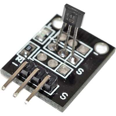Modul osazený Hallovým senzorem reaguje na změnu intenzity magnetického pole. Pokud je detekováno magnetické pole, výstup se nastaví na logickou jedničku (HIGH) a rozsvítí se...