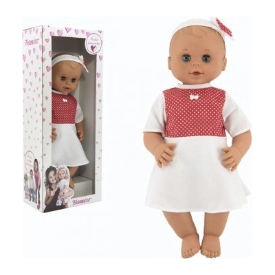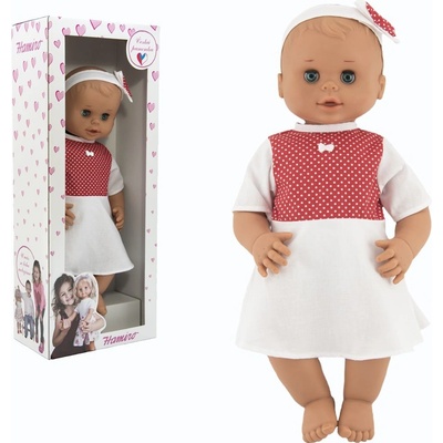 Panenka/Miminko Hamiro mrkací 50cm, pevné tělo, šaty bílé + červený puntík v krabici 24x60x15cm 0m+ Je zhotovena z pevné plastické hmoty. Tělo panenky lze omývat hadříkem namočeným ve vlažné vodě. Tuto panenku nelze koupat. Panenka má mrkací oči, které jsou v poloze...
