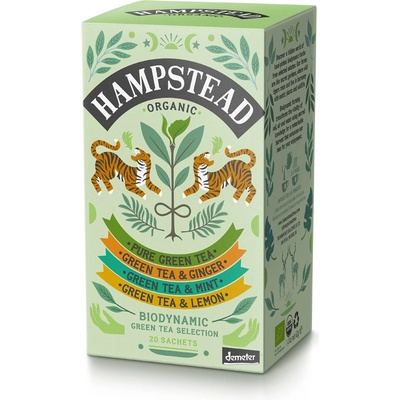 Kolekce zelených čajů značky Hampstead Tea London obsahuje výběr čistého zeleného čaje, zeleného čaje s mátou a lékořicí, zeleného čaje s limetkou a zeleného čaje s jasmínem a bergamotovým olejemBalení obsahuje 20 ks jednotlivě balených sáčků po 2 g