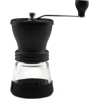 ruční, osazen mlecími kameny, keramický mlecí mechanismus, s kónickými kameny, velikost zásobníku 100 g, materiál těla sklo, nádoba na mletou kávu součástí balení, rozměry 21 × 9 × 9 cm (V׊×H), hmotnost 0,6 kg, černá barva