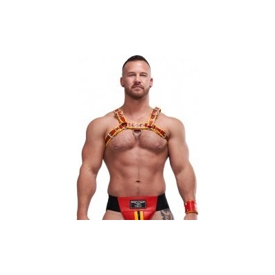 Mister B Leather Circuit Harness Red Yellow je nový kožený sexy harnss – postroj, díky kterému bude váš hrudník vypadat mohutnější, protože tlačí vaše ramena trochu dozadu....