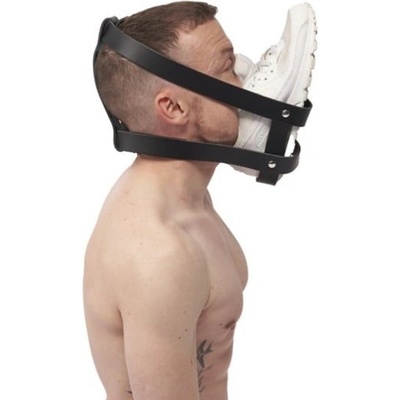 Postroj pro připevnění tenisky k obličeji suba. Velikost postroje je nastavitelná pomocí 4 přezek a 4 patentek na elastických popruzích. Vyrobený z černé kůže.