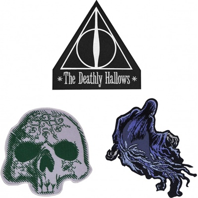 Balení 3 nášivek Relikvie smrti - Harry Potter - Výška: přibližně 10,5 cm - Složení: 100% bavlna - 3 symboly: znak Voldemorta, znak mozkomory, znak Relikvií smrti - potřebné...