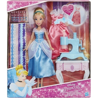 Disney Princess - Popelka a designové studio B6908. Popelka je připravena pro prince a vaše malá princezna může pro ni vytvořit nové styly na šicím stroji pomocí samolepek a drahokamů. Z jejích šatů se stanou třpytivá mistrovská díla. Panenka má dvoje šaty pro více...