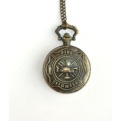 Parádní bronzové hodinky s otevíracím předním krytem, ve kterém jsou plasticky vylisované hasičské pomůcky a nápis Fire Fighter. Zadní stěna je ozdobená prolisovanými vzory....