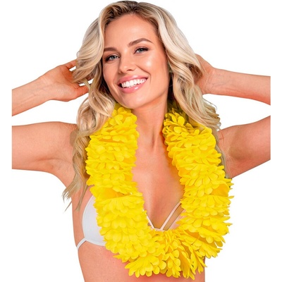 Květinový havajský věnec. Vhodný doplněk pro tematick barevnou, nebo letní havaj párty. Materiál: 90% polyester,10% polypropylen Barva: žlutá