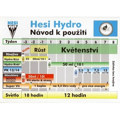 Hesi Hydro Bloom je univerzální hydroponické hnojivo, které se používá v květové fázi rostliny. Hnojivo je určené pro pěstitele indoor rostlin. Hnojivo splňuje standardy EU a je vyrobeno pouze z kvalitních přírodních látek. Poměr základních živin je následující N-P-K...