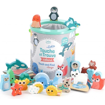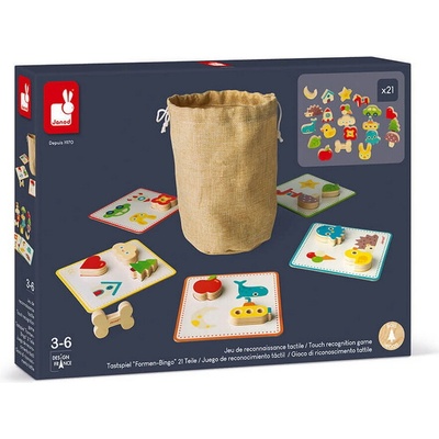 Hmatová hra pro děti od 3 let rozvíjí jemnou motoriku a rozpoznávání tvarů. Hráči hledají tvary podle hmatu a skládají je do rámečků, možné jsou různé varianty hry.
