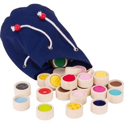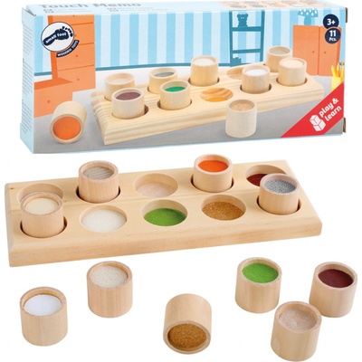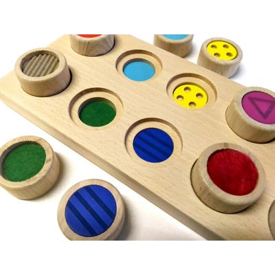 V deseti dřevěných válečcích o průměru 3 cm je deset různých druhů materiálů, stejně jako v dřevěné podložce. Dítě se zavřenýma očima musí hmatem jednotlivé materiály rozpoznat a přiřadit dřevěné válečky do odpovídajících otvorů. Tato dřevěná hračka své uplatnění...