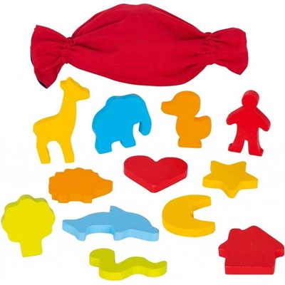 Dřevěná naučná hra - Poznej tvar. Kdo najde nejrychleji správný předmět v kouzelném sáčku? Nejmenší děti učíme podle hmatu poznat o jaký předmět se jedná. Nejdřív rodič zkouší...