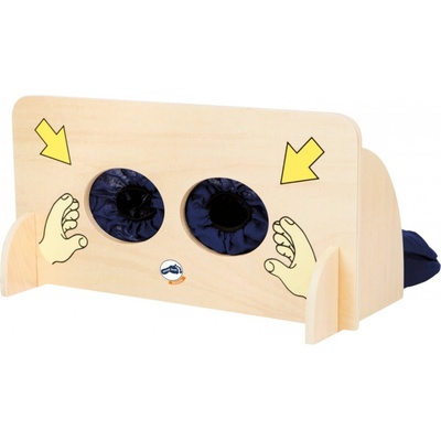 Různé předměty ukryjte do látkového pytlíku za dřevěnou stěnou. Pytlík je opatřen zipem, pro snadnější vkládání předmětů. Děti vloží ruce do textilních rukávů a podle hmatu se snaží rozpoznat, o jaký předmět se jedná. Hlavní vlastnosti: hra je vhodná také do školek...