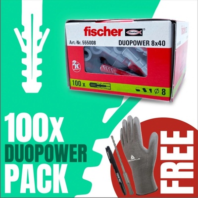 Fischer hmoždinky DuoPower Rozměr: 8x40mm CENA ZA 100 ks ! Při objednávce ZDARMA: 1 - černý značkovač Stredpro 2 - pracovní rukavice velikost 9 Deltaplus 3 - vrták SDS...