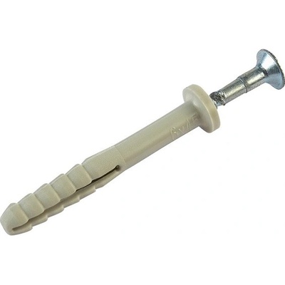 Průměr hmoždinky musí odpovídat průměru vrtané díry. Hmoždinka s kuželovým osazením a s předmontovaným závitovým hřebem. Jednoduchá montáž zatlučením hřebu, hřeb se nešroubuje!!
