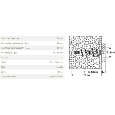 VÝHODY ▪ Osazením hmoždinky pouze do izolačního materiálu lze kotvené díly montovat bez tepelných mostů. ▪ Tvar FID umožňuje snadnou montáž skrze tenkovrstvé omítky bez...