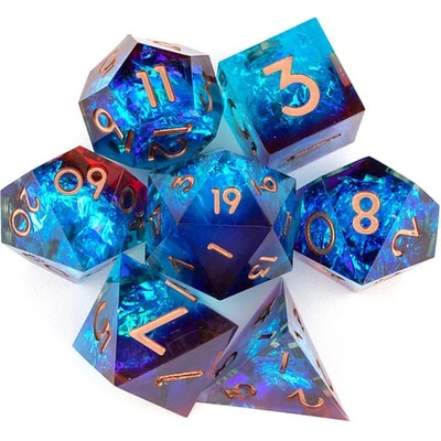 Sada sedmi vícestranných průsvitných kostek s ostrými hranami sharp edge Poseidonův hněv, evokující rozbouřený oceán. V závislosti na světelných podmínkách se může barva kostek...
