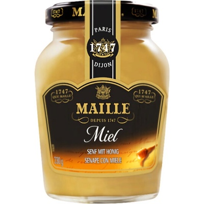 Maille Hořčice s medem 230 g Speciální hořčice s medem. Složení :cukr, pitná voda, ocet, HOŘČIČNÁ semínka, med (8%), jedlá sůl, koření, barvivo: amoniakový karamel, regulátor...