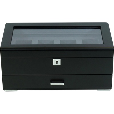 Kazeta na 6 ks náramkových hodinek nebo náramků. Ve spodní části je šuplík pro uložení prstenů, náramků, manžetových knoflíčků a další drobné šperky. Víko kazety je prosklené....