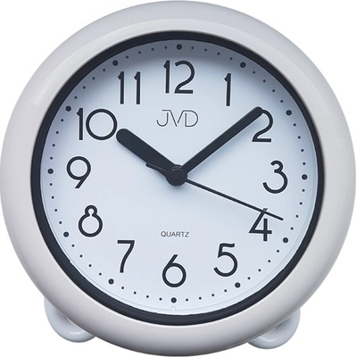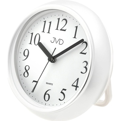 Vlhkotěsné hodiny JVD jsou ideálním doplňkem do koupelny. Provedení rámu je plastové, bílý ciferník pokrývá sklo.