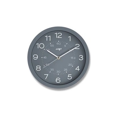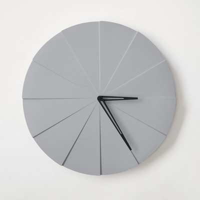 Šedé nástěnné plastové hodiny s quartzovým strojkem. Průměr číselníku 30 cm.