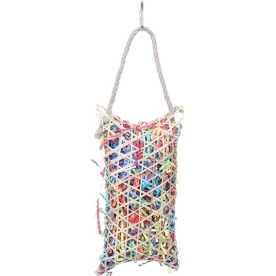 Hračka pro papušky a andulky. Vyrobeno z plastu, bavlny a sisalu. Hračka se zvonečkem. Snadno se pomocí karabinky připevňuje ke kleci. Ideální zábava a pěkný prvek do klece pro...